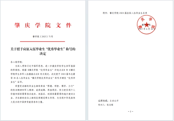 近日,学校下发《关于授予应征入伍毕业生“优秀毕业生”称号的决定》。其中,william威廉中文官网2020级历史学2班廖展锋、2020级酒店管理1班李健俊、2020级酒店管理1班林梓豪、2020级旅游管理1班黄志炜等4 名入伍毕业生被授予“肇庆学院优秀毕业生”称号并颁发“优秀毕业生”证书。