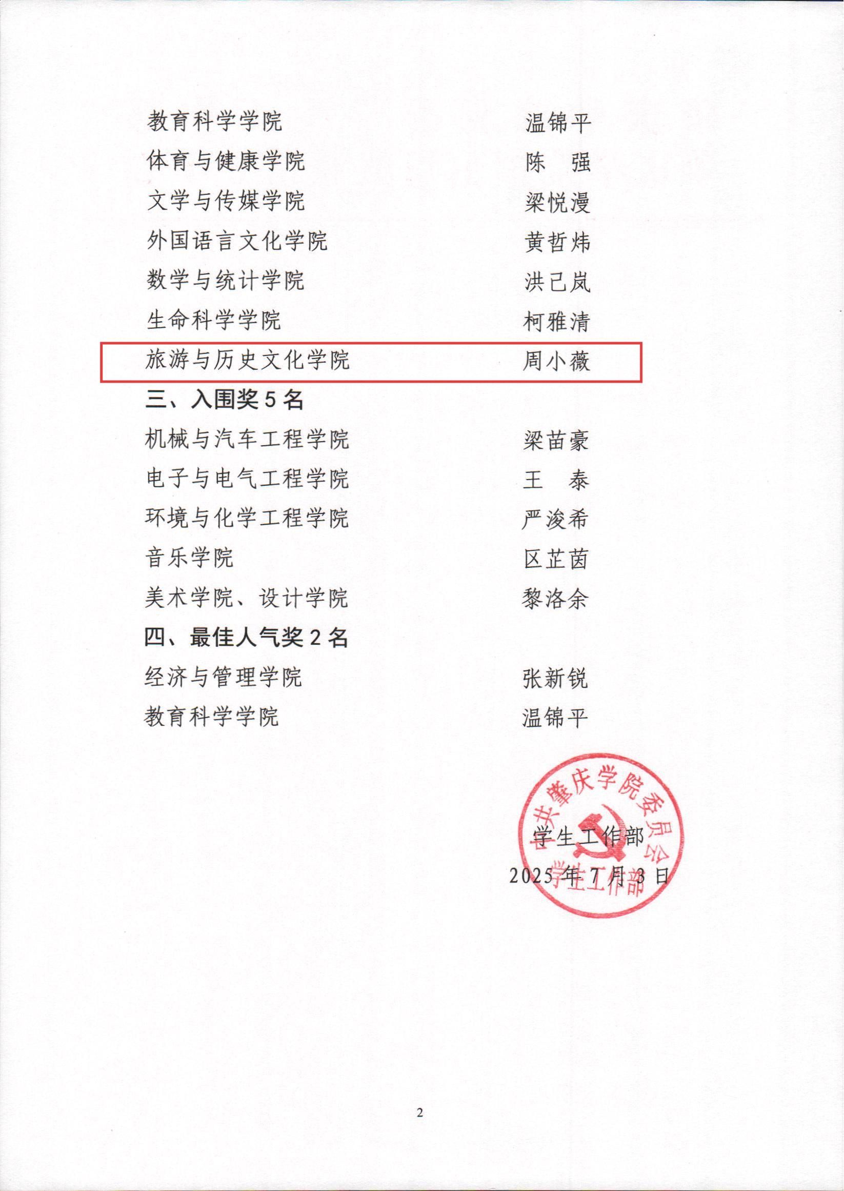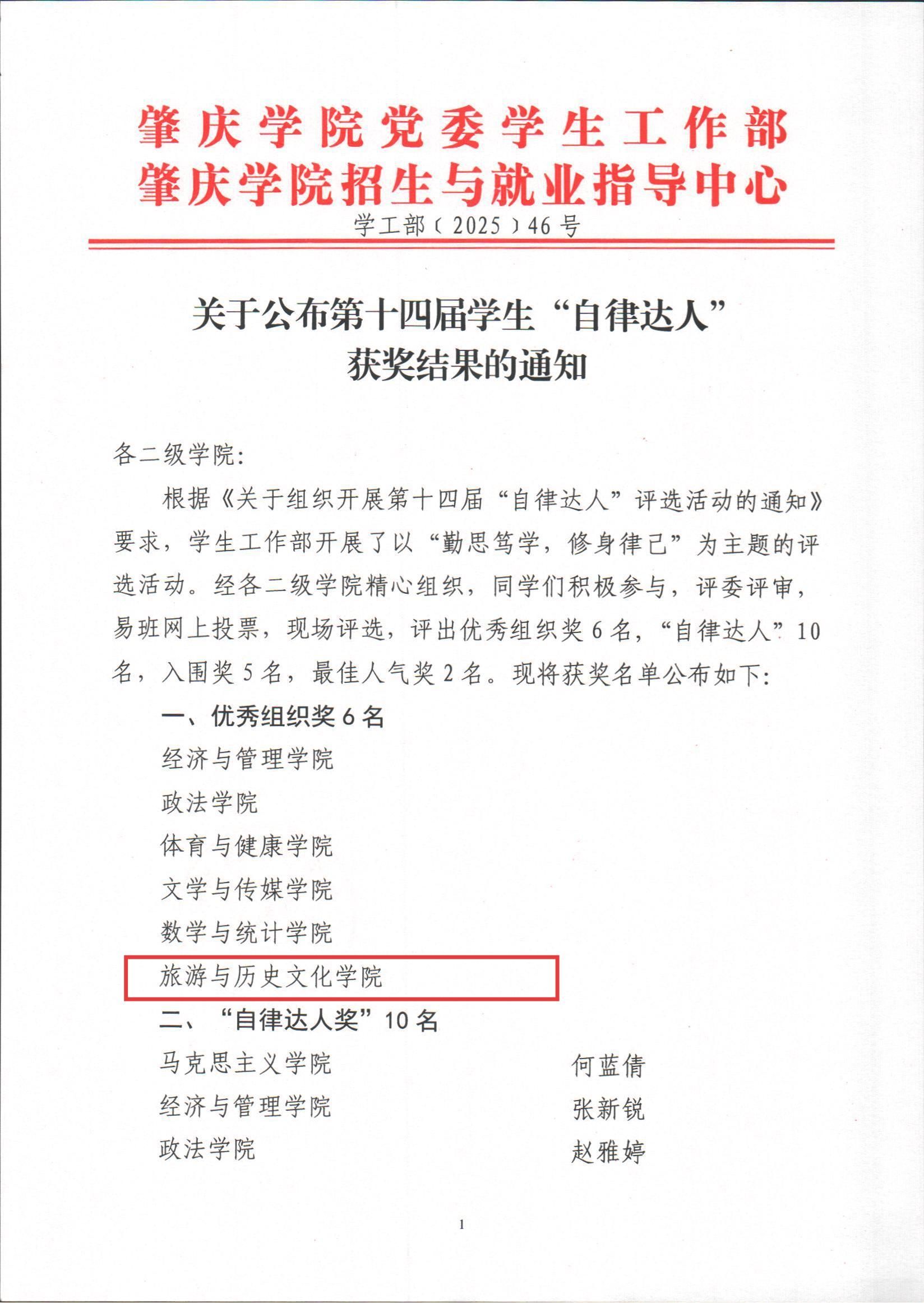 在肇庆学院第十四届学生 “自律达人” 评选活动中,旅游与历史文化学院表现亮眼,不仅荣获 “优秀组织奖”,来自22级旅游管理专业的周小薇同学更凭借出色的自律能力与感染力十足的演讲,成功入选 “自律达人” 10 强名单。