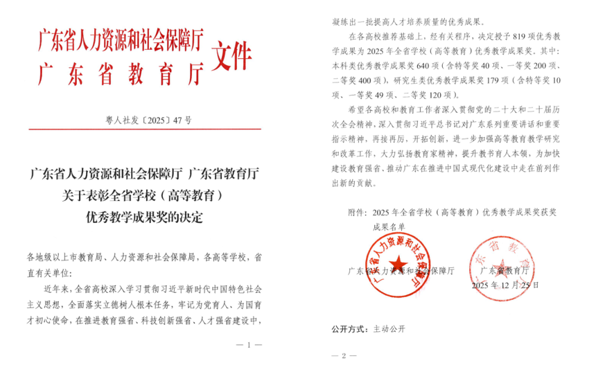 广东省高等教育优秀教学成果奖是我省高等教育领域教学成果的最高荣誉,旨在表彰教育教学实践中勇于突破、兼具创新与推广价值成果的单位及个人。本届评选产生本科类成果640项,包含特等奖40项、一等奖200项、二等奖400项,集中展现了全省高校落实立德树人根本任务、推进高等教育高质量发展的最新成效。