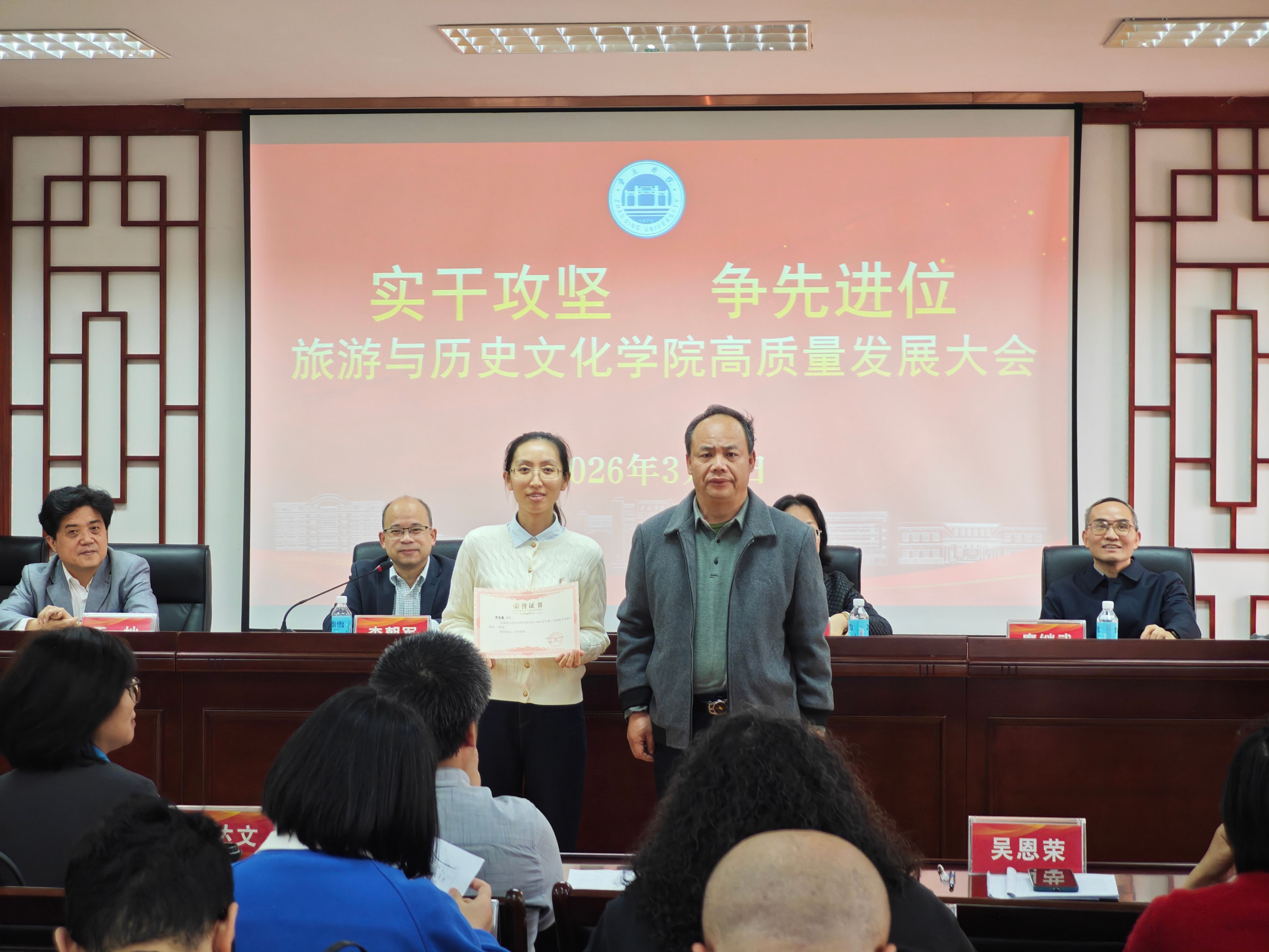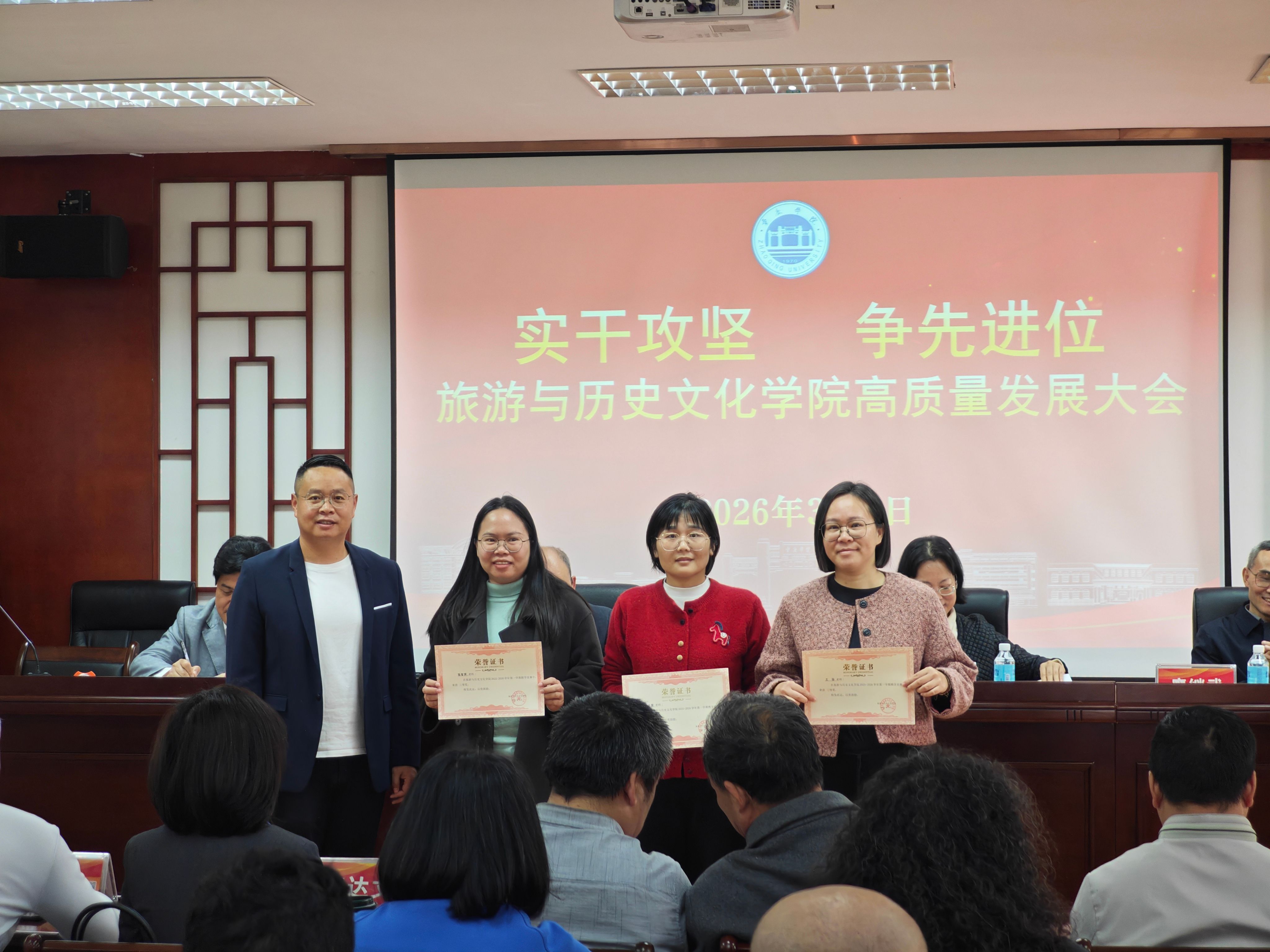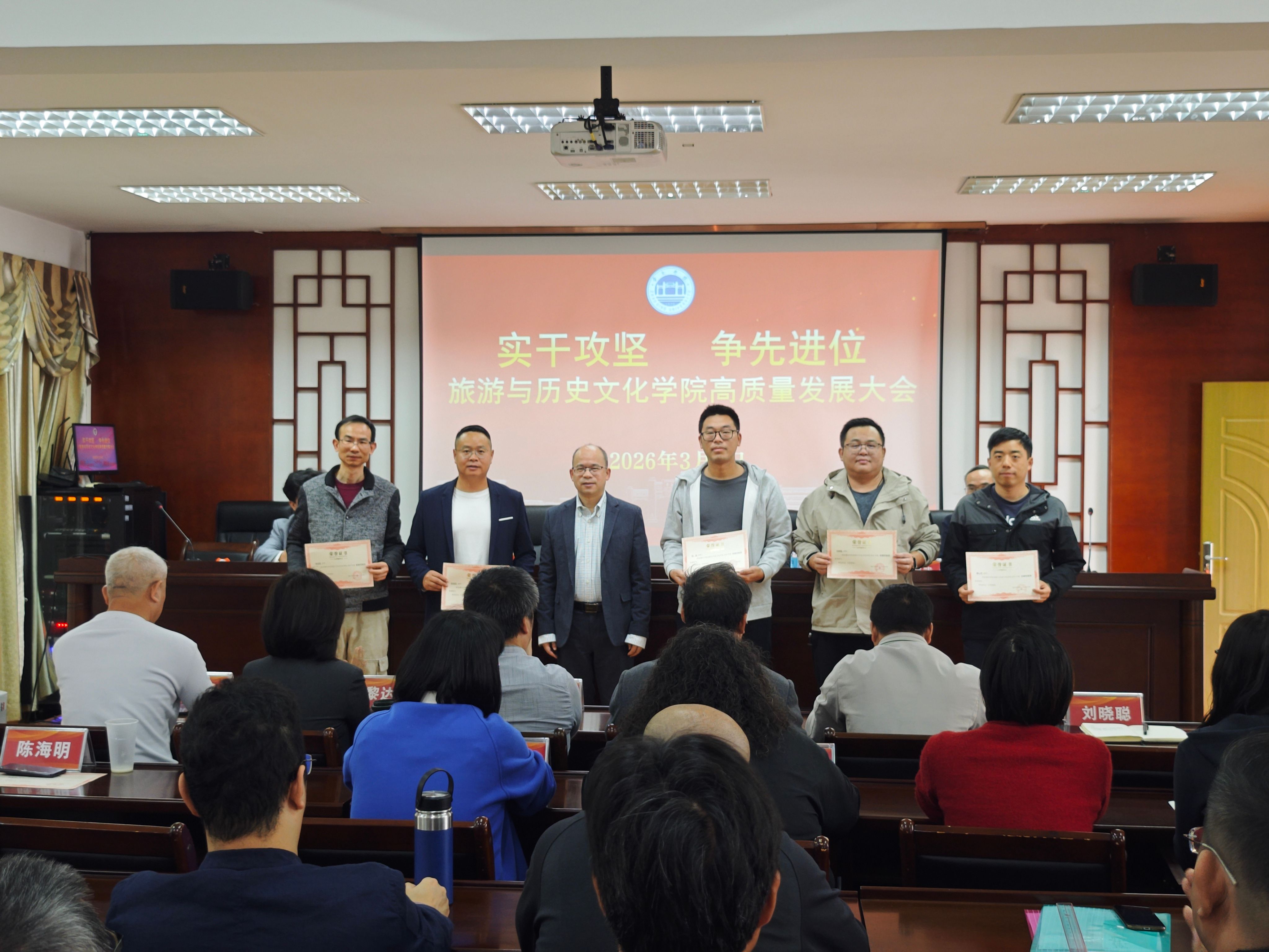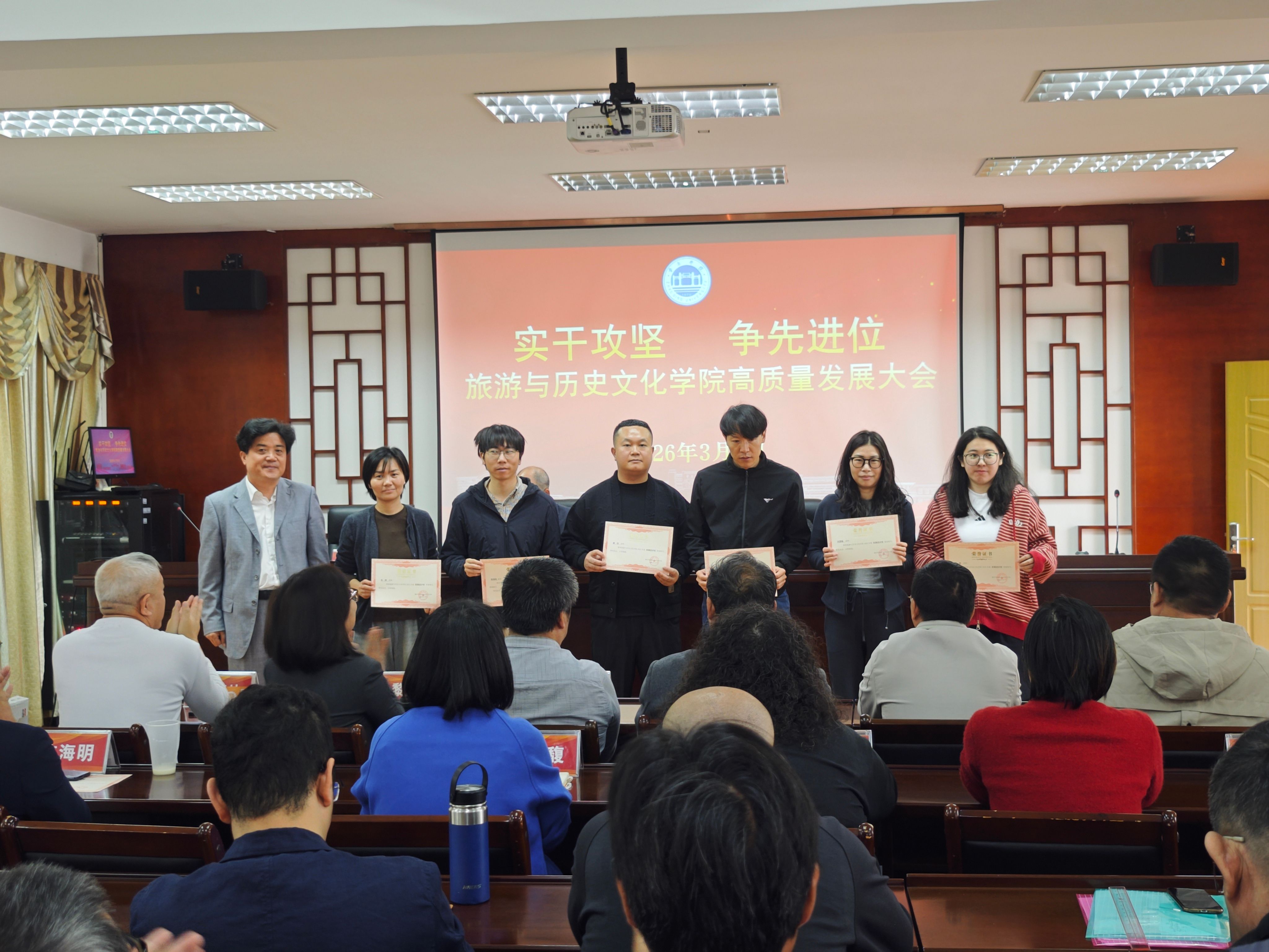 为深入贯彻学校高质量发展部署要求,凝聚全院师生奋进力量,锚定学院发展新目标,3月8日,旅游与历史文化学院隆重召开以“实干攻坚 争先进位”为主题的高质量发展大会。学院全体教职工参会,会议全面复盘发展成果、谋划未来蓝图,同步表彰先进典型,奏响学院高质量发展奋进强音。