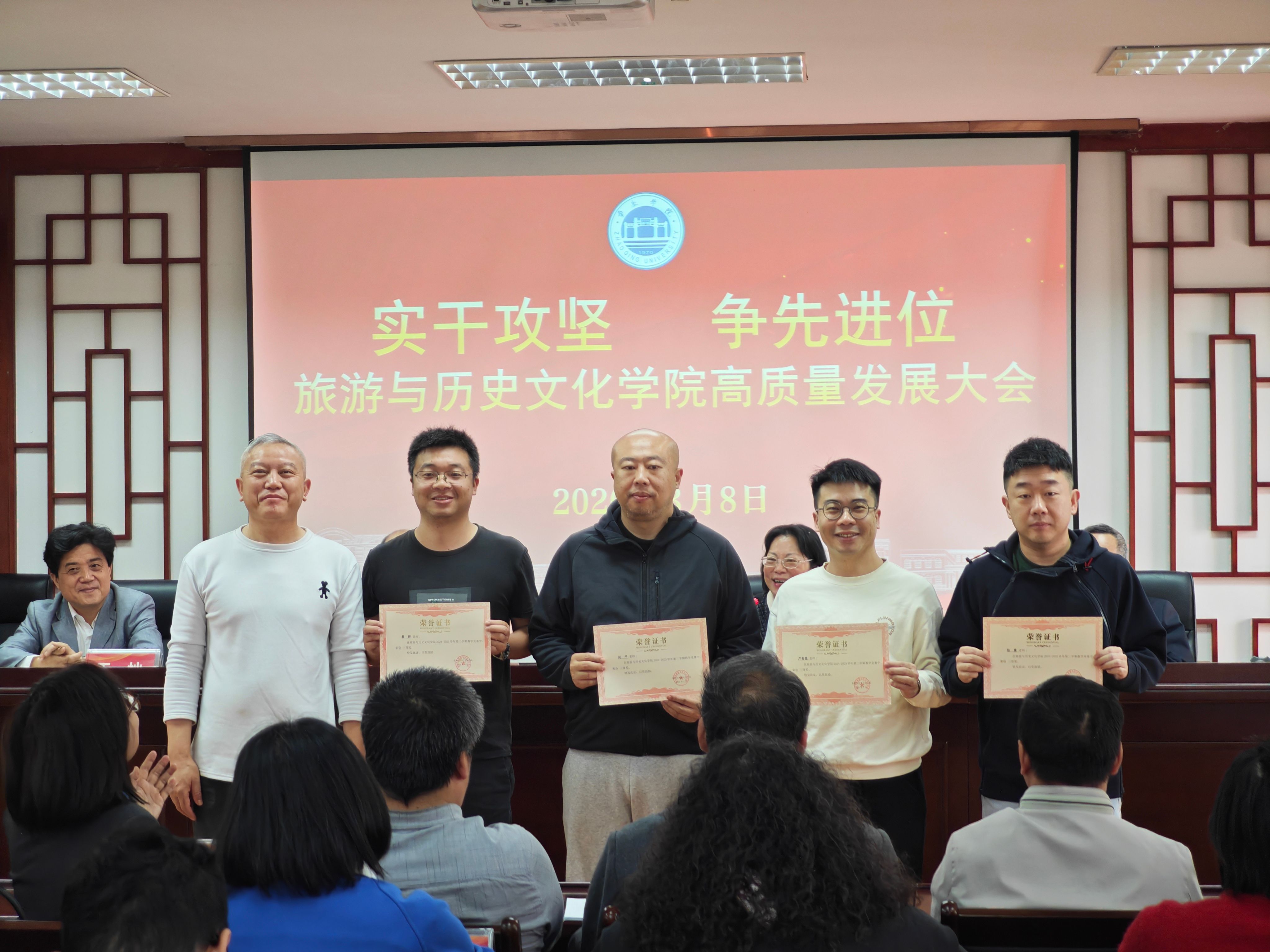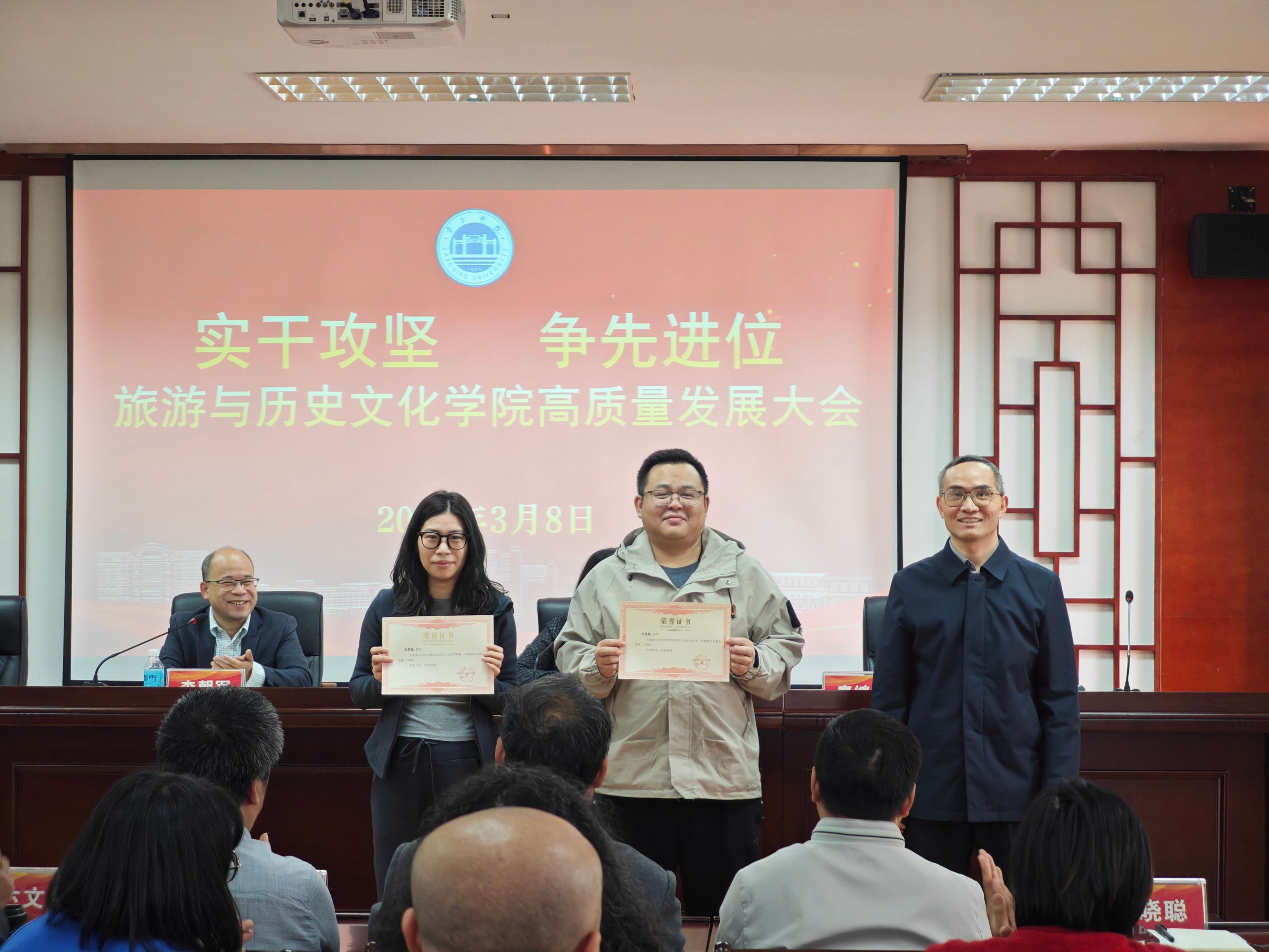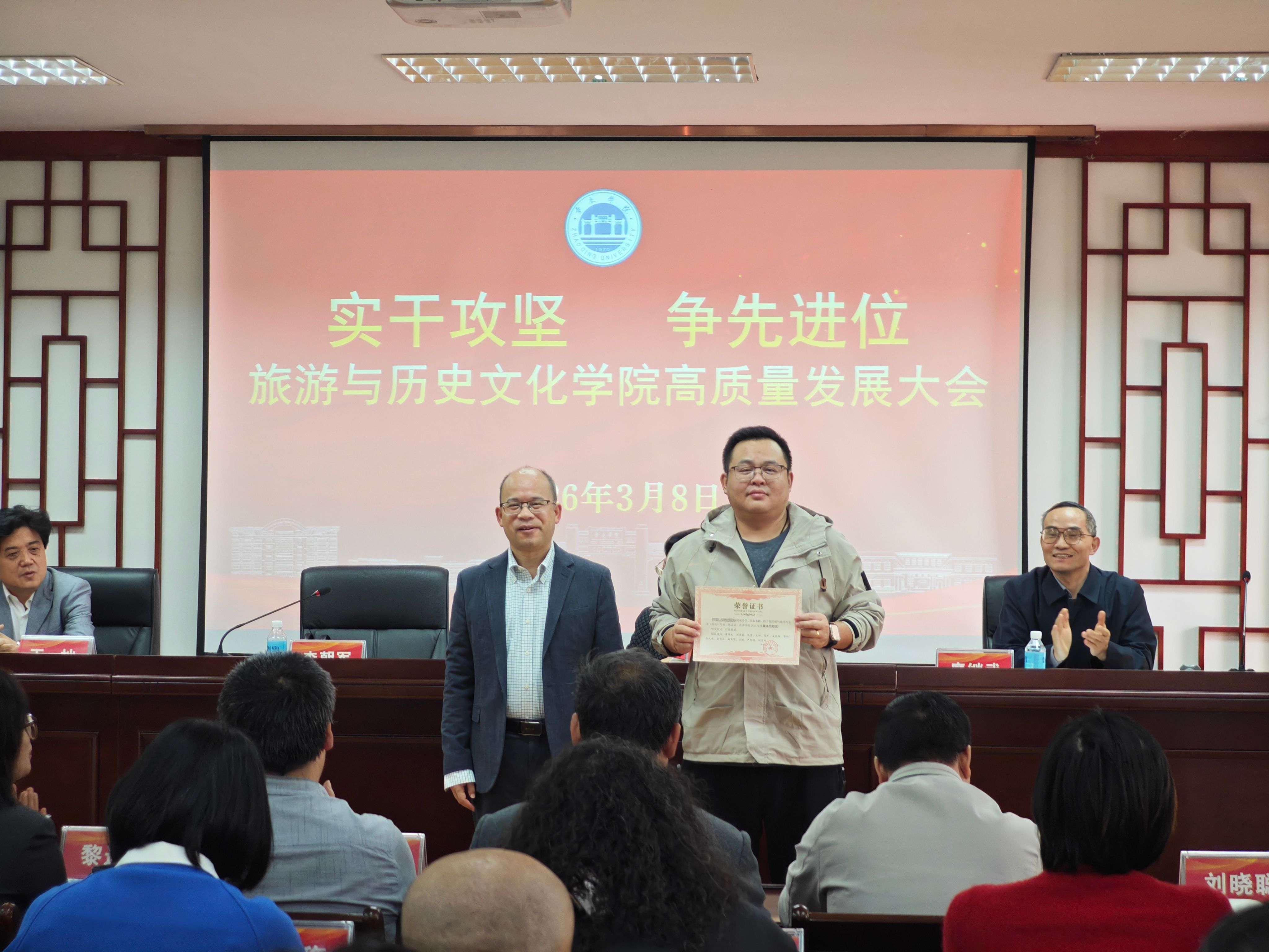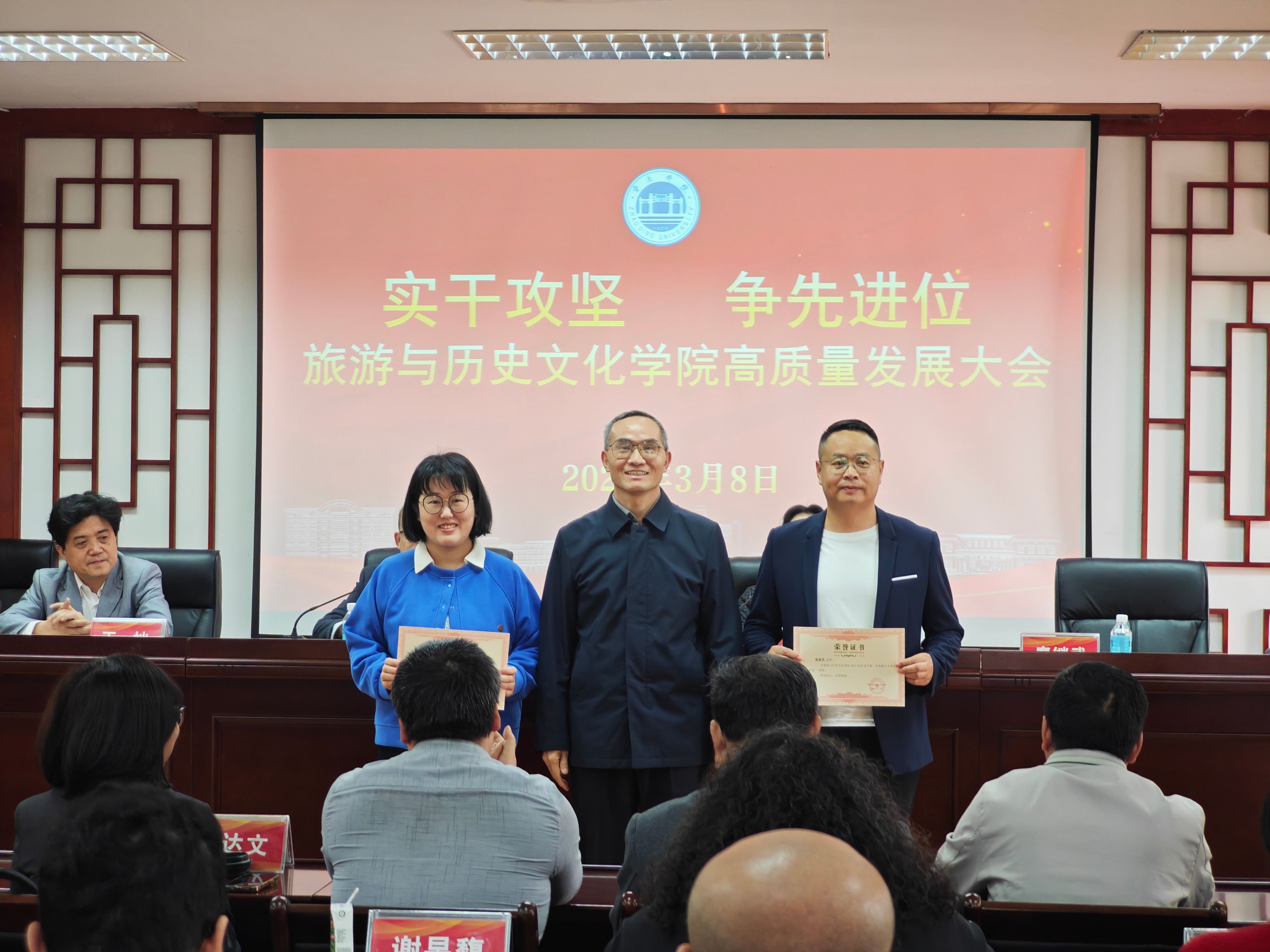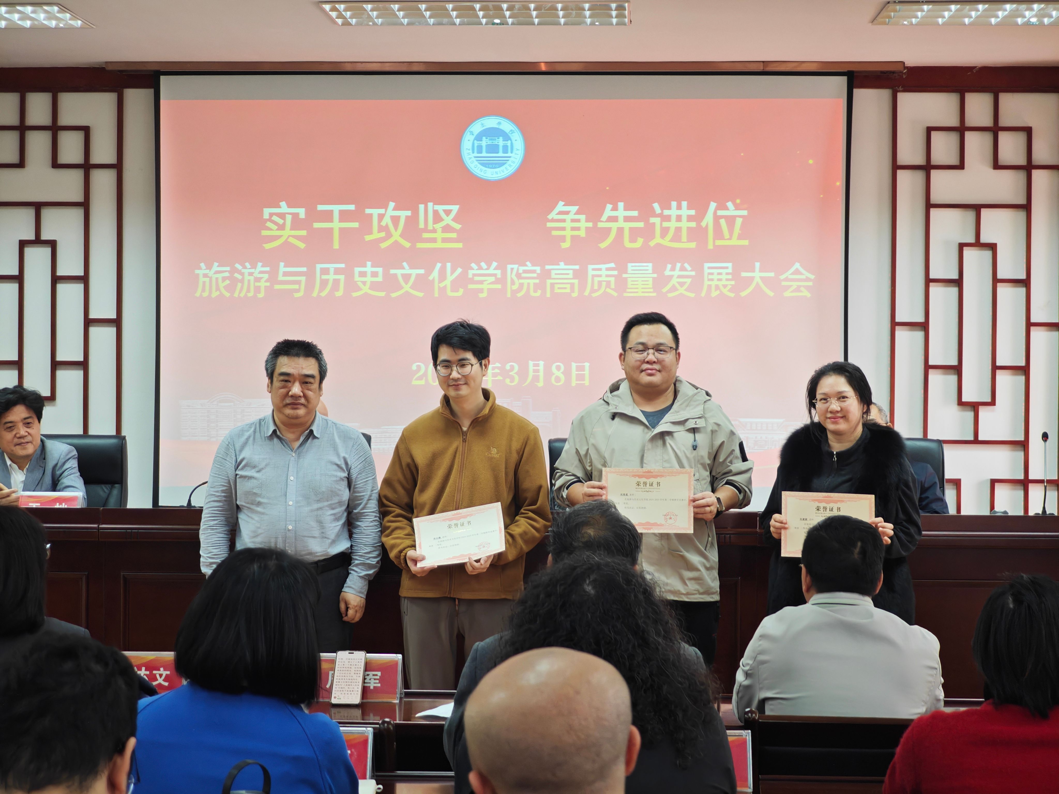 为深入贯彻学校高质量发展部署要求,凝聚全院师生奋进力量,锚定学院发展新目标,3月8日,旅游与历史文化学院隆重召开以“实干攻坚 争先进位”为主题的高质量发展大会。学院全体教职工参会,会议全面复盘发展成果、谋划未来蓝图,同步表彰先进典型,奏响学院高质量发展奋进强音。
