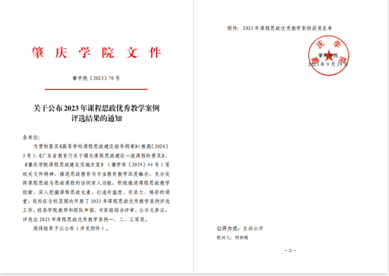 为贯彻落实《高等学校课程思政建设指导纲要》(教高〔2020〕3号)、《广东省教育厅关于强化课程思政建设一流课程的意见》、《肇庆学院课程思政建设实施方案》(肇学委〔2019〕44 号)等相关文件精神,推进思政教育与专业教育教学深度融合,充分发挥课程思政与思政课程的协同育人功能,积极推进课程思政教学创新,深入挖掘课程思政元素,打造有温度、有活力、精彩的课堂,近日,肇庆学院公布了2023年课程思政优秀教学案例一、二、三等奖,我院杜云南老师喜喜获二等奖、王灿老师喜获三等奖。