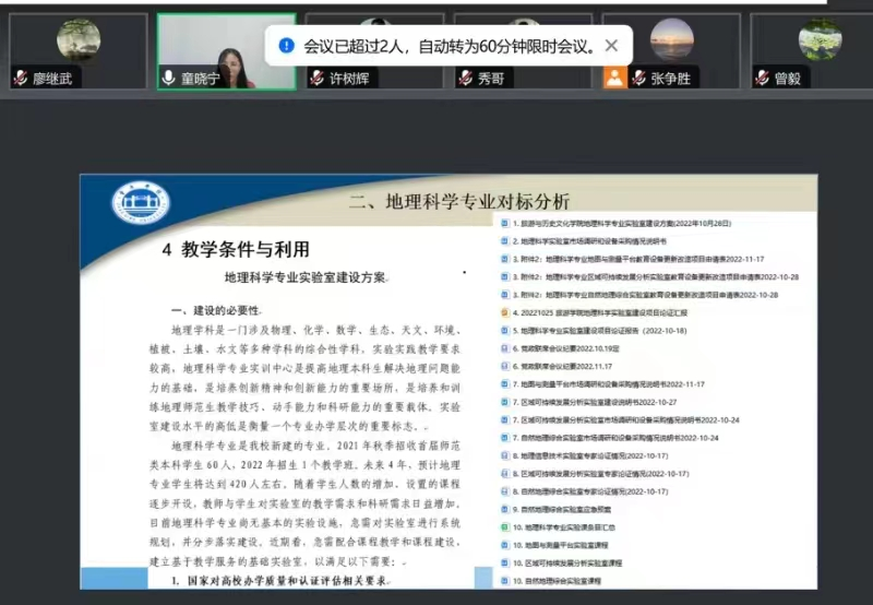 近日,旅游与历史文化学院举行地理科学专业新增学士学位授予工作专家论证会。华南师大张争胜教授、岭南师院尚志海教授、韶关学院许树辉教授、肇庆市教育局吴毓秀教研员、我校教学督导与评估中心曾毅教授等五位校内外专家,旅游学院副院长廖继武、地理科学系主任童晓宁以及地理科学系骨干教师通过线上线下相结合的方式共同参加。