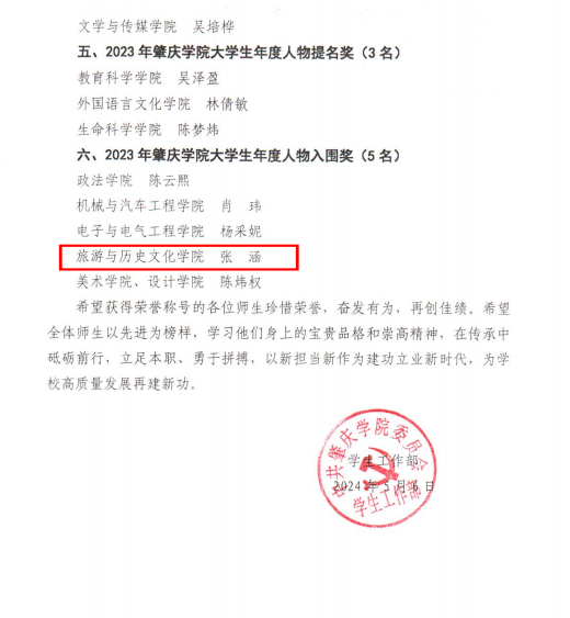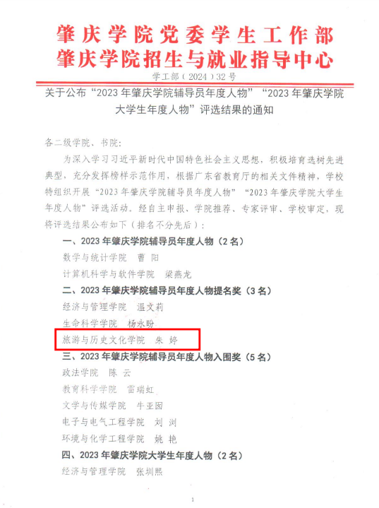 为深入学习习近平新时代中国特色社会主义思想,积极培育选树先进典型,充分发挥榜样示范作用,根据广东省教育厅的相关文件精神,学校特组织开展“2023年肇庆学院辅导员年度人物”“2023年肇庆学院大学生年度人物”评选活动。经自主申报、学院推荐、专家评审、学校审定,近日公布评选结果。其中,我院辅导员朱婷老师荣获2023 年肇庆学院辅导员年度人物提名奖、2020级旅游管理专业张涵同学荣获2023 年肇庆学院大学生年度人物入围奖。