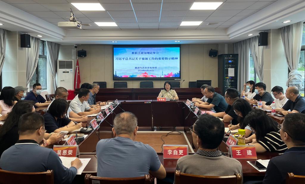 杨雪梅领学习近平总书记关于旅游工作的重要指示精神。她表示,我们要把深入学习贯彻习近平总书记重要指示和关于旅游发展的一系列重要论述作为当前和今后一个时期的重要政治任务,在全院掀起学习热潮。要将贯彻全国旅游发展大会精神和做好立德树人工作贯通起来,持续推动校地合作和产学研工作,助力“百千万工程”;进一步建设文旅产业学院,着力推动旅游管理数字化转型。要把学习成果转化为干事创业的强大动力,运用到科研工作中,落实到社会服务中,体现在人才培养成果中,以旅院力量推动建设旅游强国。