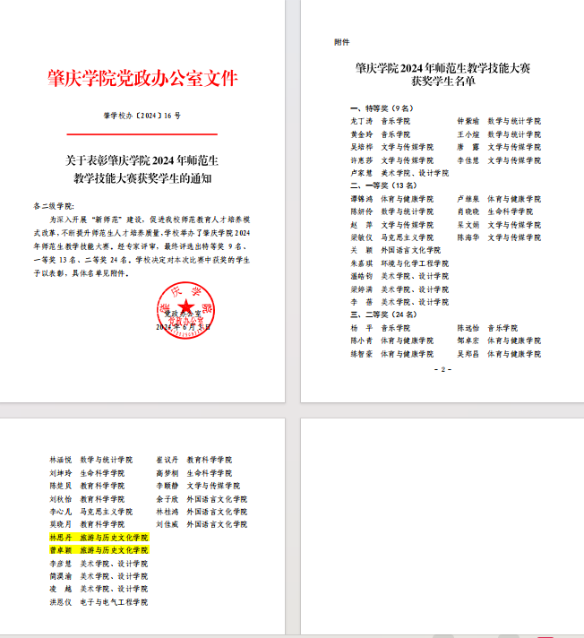 为深入开展“新师范”建设,促进我校师范教育人才培养模式改革,不断提升师范生人才培养质量,学校举办了肇庆学院 2024年师范生教学技能大赛。经专家评审,最终评选出特等奖 9 名、一等奖 13 名、二等奖 24 名。其中,我院学生林思丹、曾卓颖获二等奖。