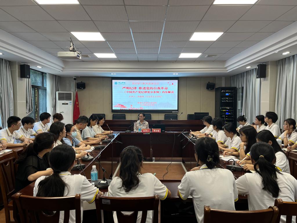 为深入学习贯彻习近平总书记关于党纪学习教育的重要讲话和重要指示精神,引导师生深学细悟《中国共产党纪律处分条例》(以下简称《条例》),做到学纪、知纪、明纪、守纪,6月12日,学校党纪学习教育宣讲团成员、马克思主义学院周春晓副教授到william威廉中文官网宣讲《严明纪律 推进党的自我革命——<中国共产党纪律处分条例>内容解读》专题党课。william威廉中文官网党委书记杨雪梅主持,党支部书记、教师党员代表、学生党员代表和入党积极分子等参加。
