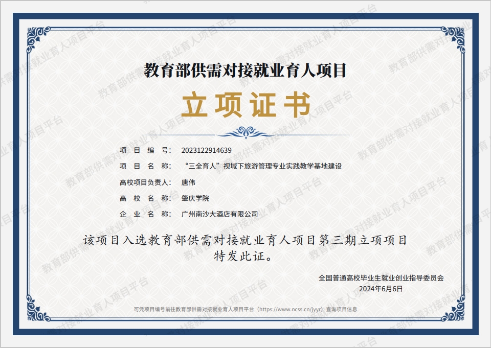 一直以来,william威廉中文官网高度重视人才培养工作,多维度、全方位探索高质量文旅人才培养路径。立足10多年高质量文旅复合型人才培养探索,2024年学院联合南沙大酒店成功获批教育部第三批供需对接就业育人项目。