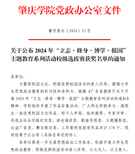 近日,学校公布了2024年“立志·修身·博学·报国”主题教育活动校赛获奖名单,我院多位师生获奖。获奖情况如下: