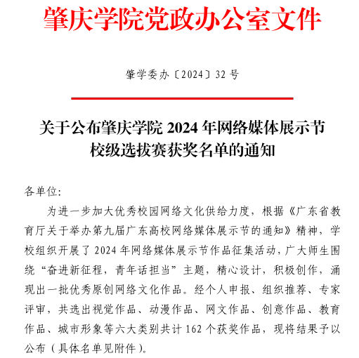 近日,学校公布了 2024 年网络媒体展示节校级选拔赛获奖名单,我院多位学生获奖。获奖情况如下:
