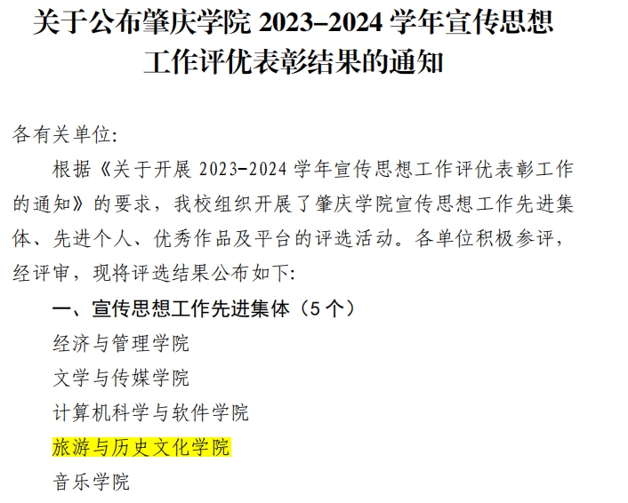 近日,我校正式公布了肇庆学院2023-2024学年宣传思想工作评优表彰结果。我院凭借出色的宣传思想工作表现,荣获先进集体称号,这是对我院宣传思想工作的高度认可和肯定。