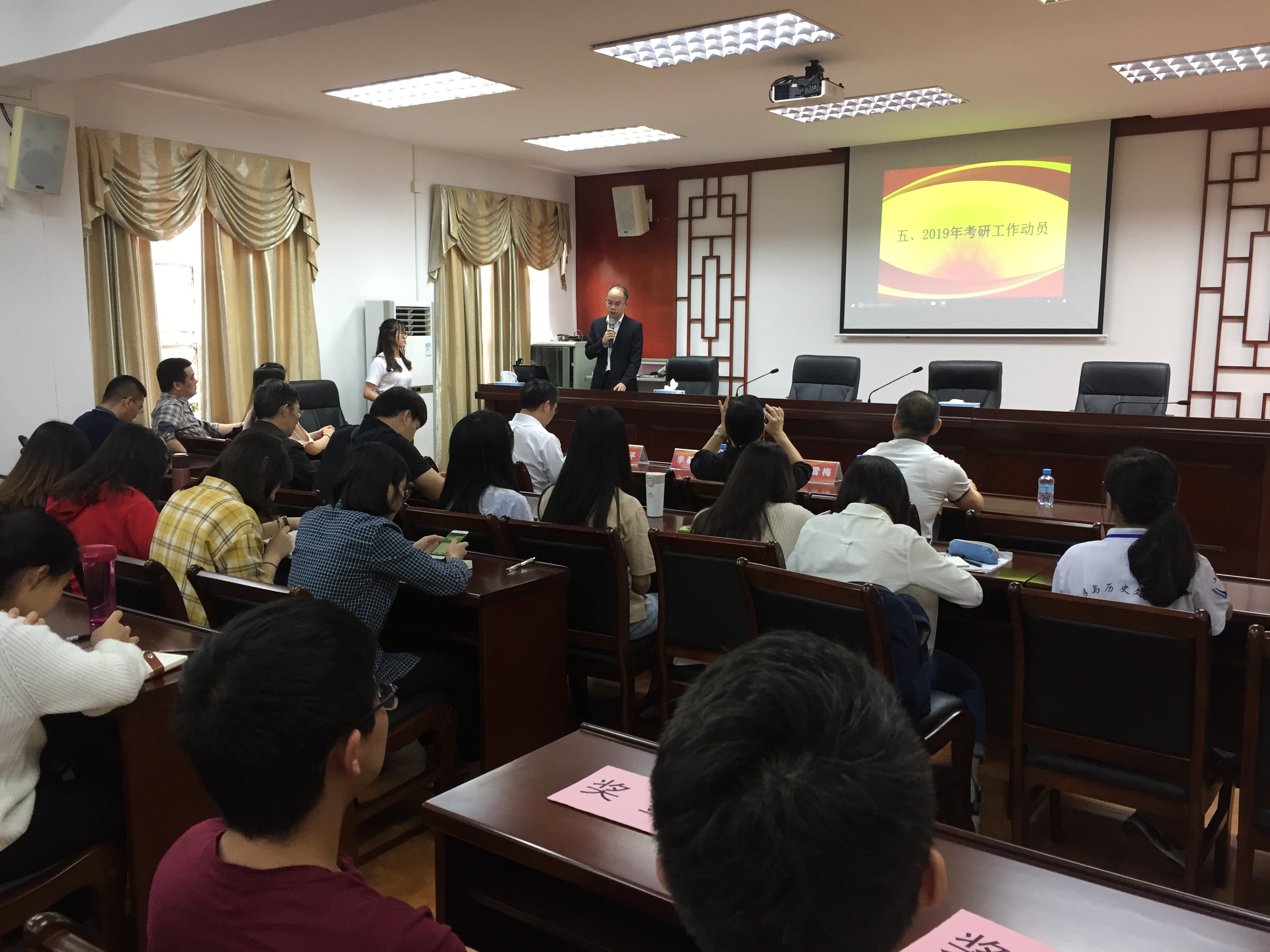 (本网讯 陈伊涵)4月25日下午,我院在文笔峰二楼报告厅召开了2018年考研工作总结暨2019年考研工作动员大会。出席本次大会的有副院长李朝军、党委书记杨雪梅、副院长刘利平、党委副书记陈军、院学术委员主任李怀顺教授以及部分教师和学生代表共80多人。