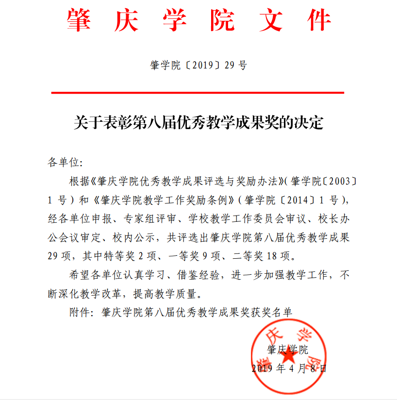 近日,根据《肇庆学院优秀教学成果评选与奖励办法》和《肇庆学院教学工作奖励条例》,经专家组评审、教学工作委员会审议,共评出肇庆学院第八届优秀教学成果29项,其中特等奖2项、一等奖9项、二等奖18项。