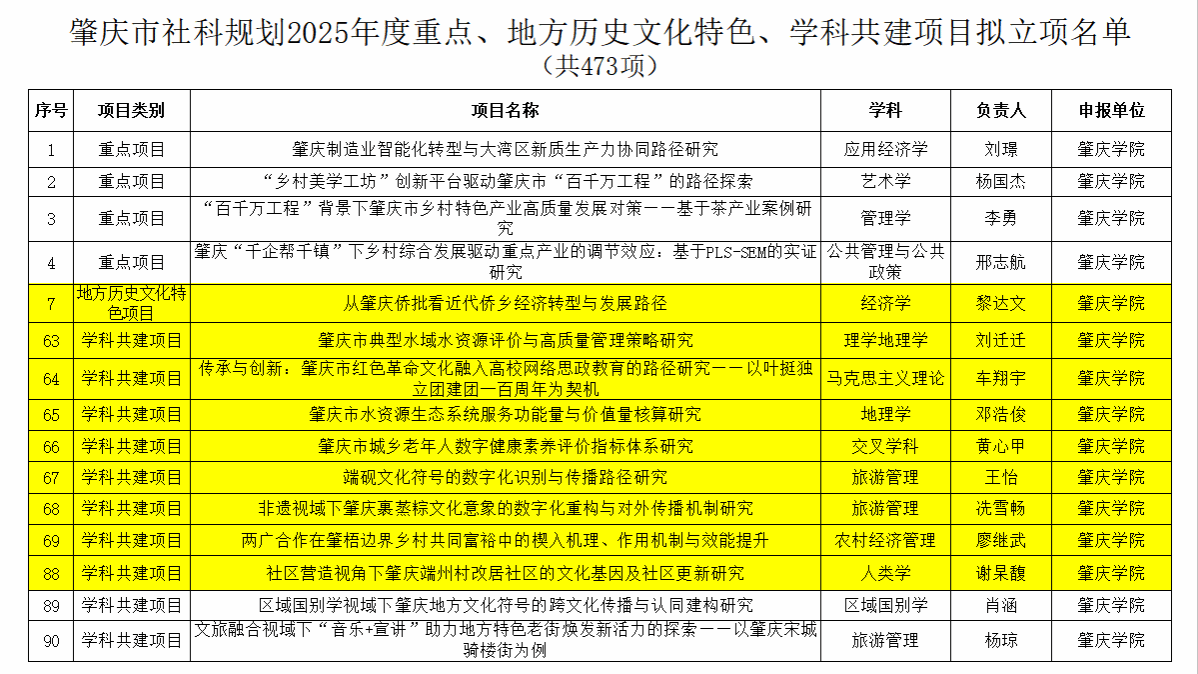 近日,肇庆市哲学社会科学规划2025年度重点、地方历史文化特色及学科共建项目拟立项名单正式公布。我院廖继武、黎达文、刘迁迁、车翔宇、邓浩俊、黄心甲、王怡、谢杲馥和冼雪畅共九位教师的科研项目成功获批立项,涵盖地方历史文化特色和学科共建两大范畴,为我市文化传承与产业发展提供了有力的理论支撑和实践指导。