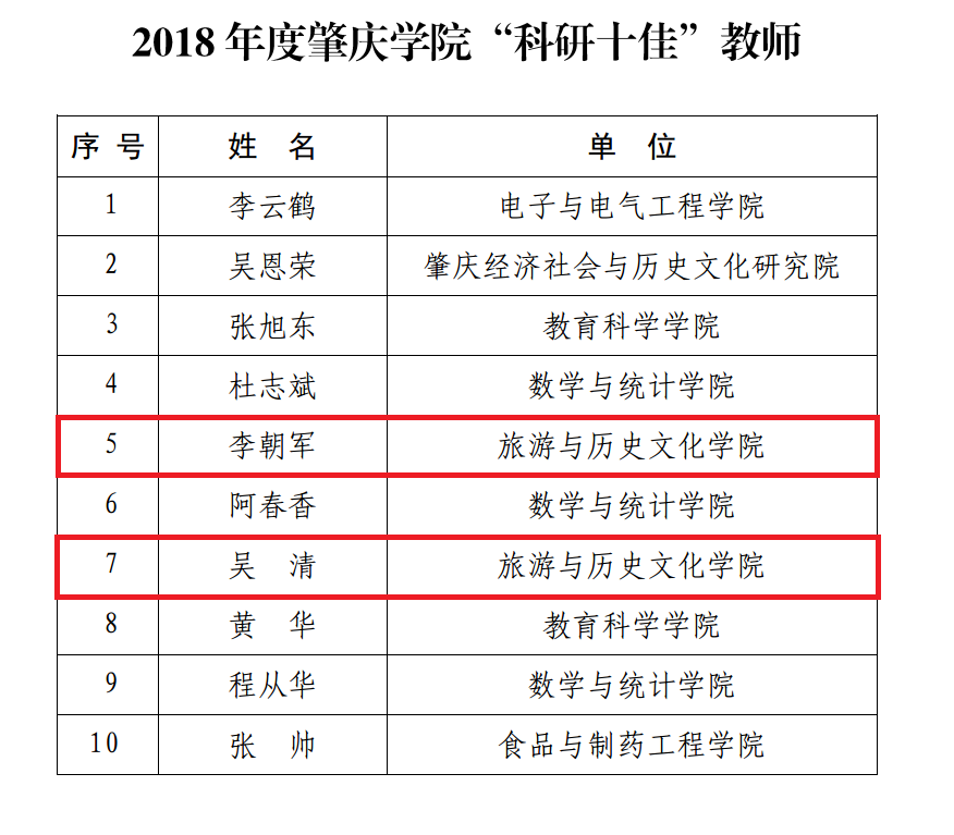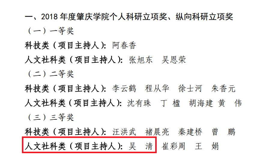 根据《肇庆学院“科研十佳”评选办法》、《肇庆学院科研工作量计算和奖励性绩效管理办法(试行)》经个人申报、程序审查、学术委员会审议、校长办公室会议审定等程序,评选出我校2018年度“科研十佳”教师和2018年个人科研立项奖及个人科研成果奖。我院李朝军、吴清两位老师荣获2018年“科研十佳”教师,2018年个人科研立项奖及个人科研成果奖。
