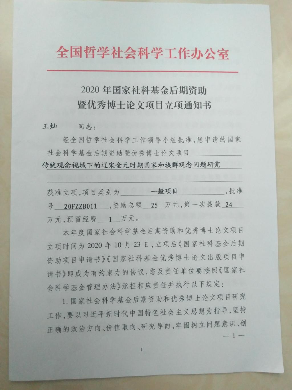 年国家社科基金后期资助暨优秀博士论文项目立项通知,我院王灿老师申请的项目《传统观念视域下的辽宋金元时期国家和族群观念问题研究》获准一般项目立项。