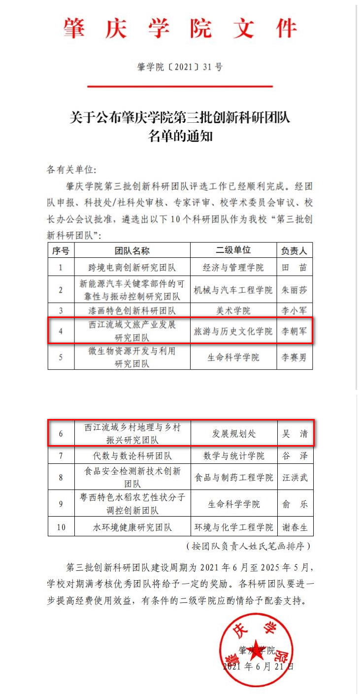西江流域文旅产业发展研究团队、吴清博士领衔的西江流域乡村地理与乡村振兴研究团队获评。本次获奖,实现了我院科研团队建设的新突破,为我院旅游、地理专业科研发展奠定了坚实基础。