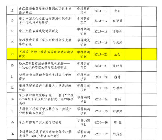 近日,肇庆市哲学社会科学2022年度规划项目立项评审结果正式公布。我院王怡老师申报的《“双碳”目标下肇庆低碳旅游城市建设研究》获得立项。