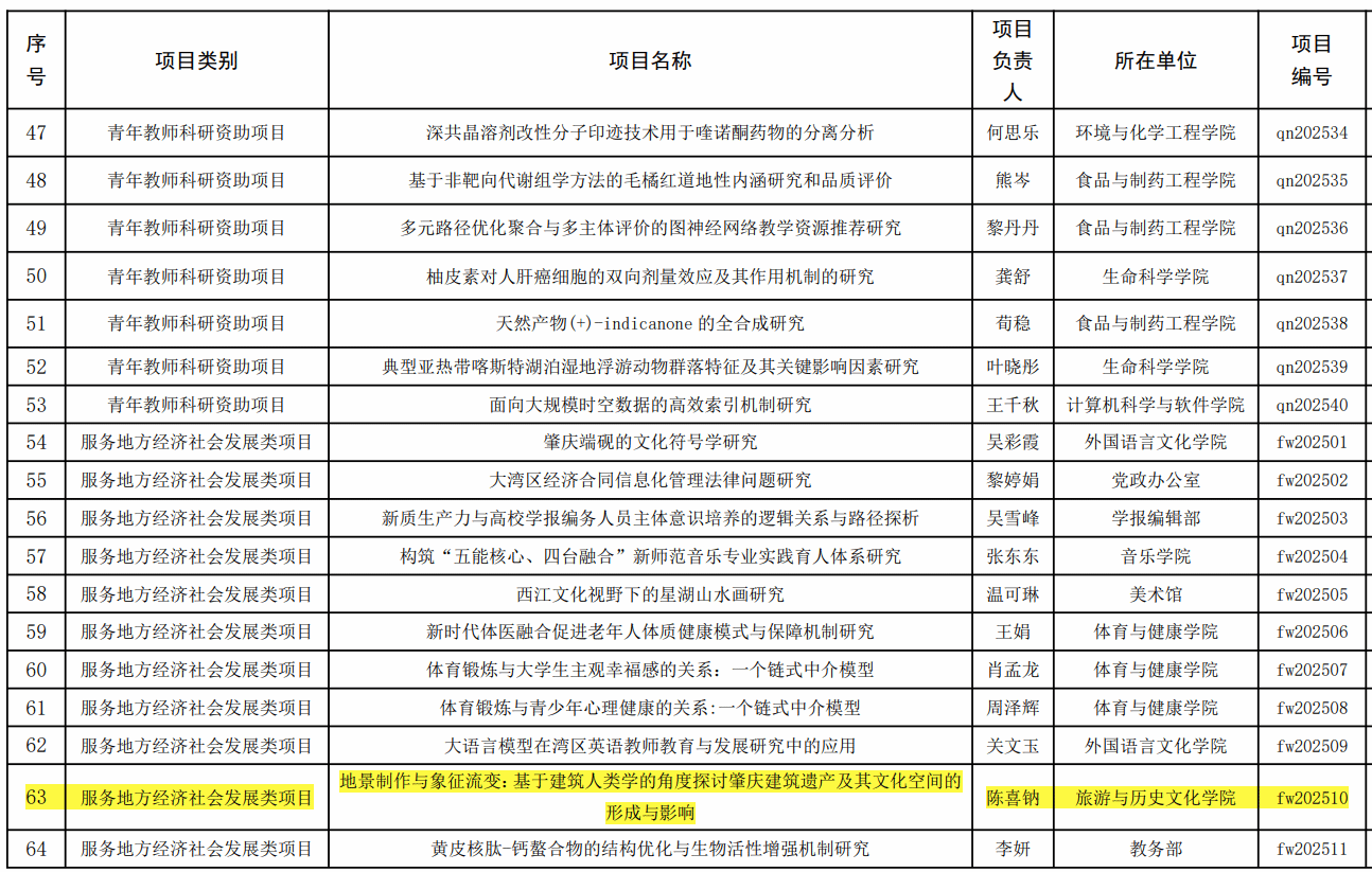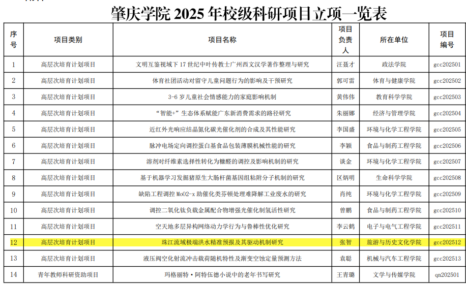 近日,2025年校级科研项目立项名单公布,我院三项目获批立项。其中,张智老师的《珠江流域极端洪水精准预报及其驱动机制研究》获高层次培育计划项目立项;陈喜钠老师的《地景制作与象征流变:基于建筑人类学的角度探讨肇庆建筑遗产及其文化空间的形成与影响》获服务地方经济社会发展类项目立项;车翔宇老师的《网络育人类高校辅导员工作室建设有效路径研究》获辅导员专项立项。
