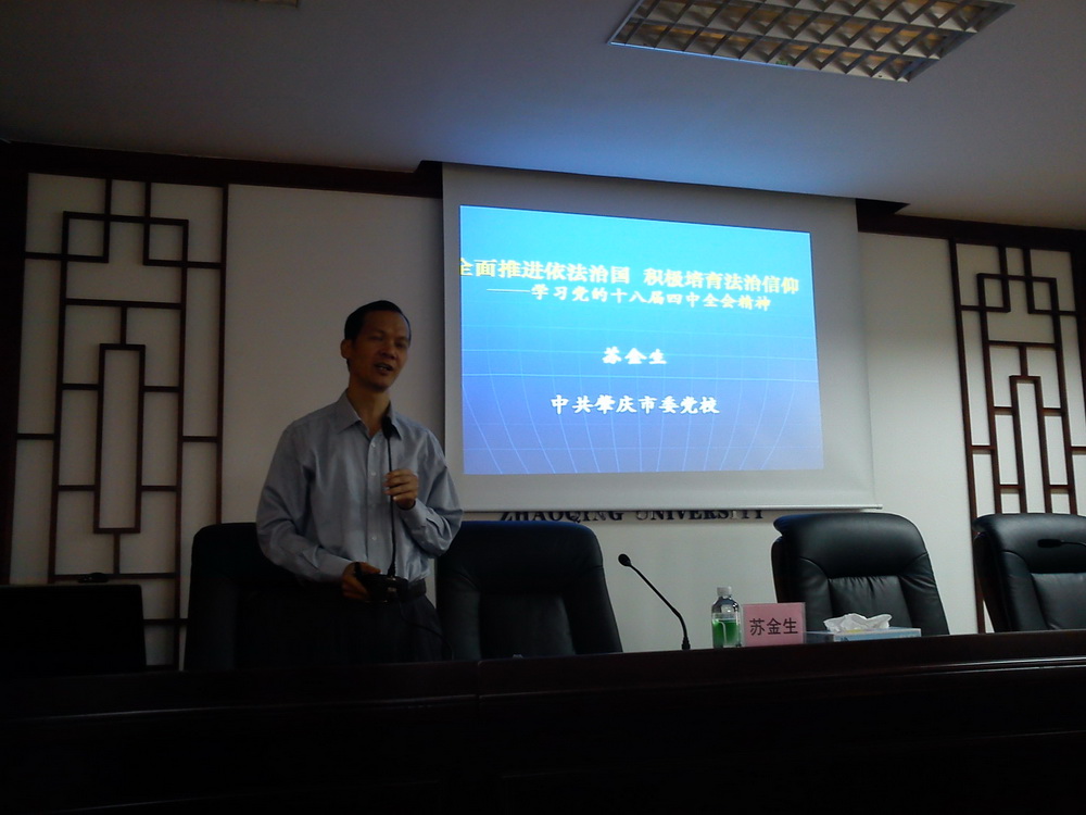 11月26日下午,我院邀请中共肇庆市委党校常务副校长苏金生教授,为我院师生党员、入党发展对象举办了一场关于“全面推进依法治国,积极培育法治信仰——学习党的十八届四中全会精神”的专题讲座。