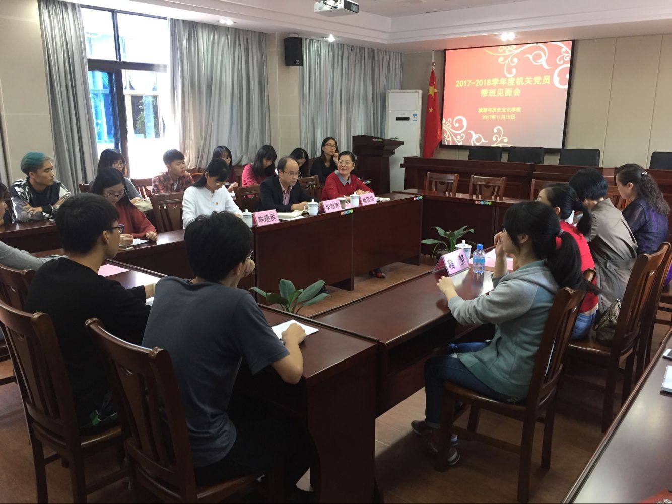 2017年11月10日中午,旅游与历史文化学院举办2017-2018学年度机关党员带班见面会,学院李朝军副院长、杨雪梅副书记分别讲话;机关带班党员范雪梅、程慧和岳春杰三位老师作了发言,与所带班级进行了对接交流,搭建沟通平台。我院将充分发挥三位带班党员所依托的文博、图书、星湖三大资源,利用好机关带班党员的好点子、好资源、好平台,充分发挥机关党员在党建、思政和学生工作中的示范引领作用,推动我院学生工作再上台阶!