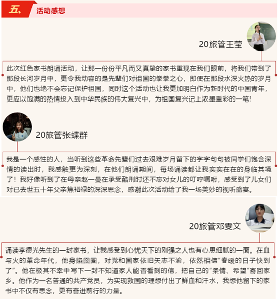 余院长表示,活动非常成功。他说,“家书既平凡也不平凡”。家书虽短,但字字珍贵,寄托了革命先烈浓浓的亲情。旅院学子用最深情的声音朗诵最美的家书,让师生接受红色洗礼,营造爱党爱国的良好氛围。希望同学们在和平年代以革命先烈为模范,坚信共产主义信念,坚信社会主义道路,弘扬红色精神,争当有责任有担当的时代新人。