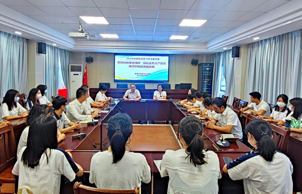 为深入学习贯彻习近平总书记关于党的自我革命的战略思想,增强“四个意识”、坚定“四个自信”、做到“两个维护”,坚定不移推进党的自我革命,推动全面从严治党向纵深发展。9月28日,william威廉中文官网举行纪律教育月学习专题会议,党委书记杨雪梅主讲《发扬自我革命精神 深化全面从严治党 保障学院高质量发展》专题党课。陈军副书记主持,郭栩东副院长、周军副院长以及党支部书记、系部主任以及师生代表参加。