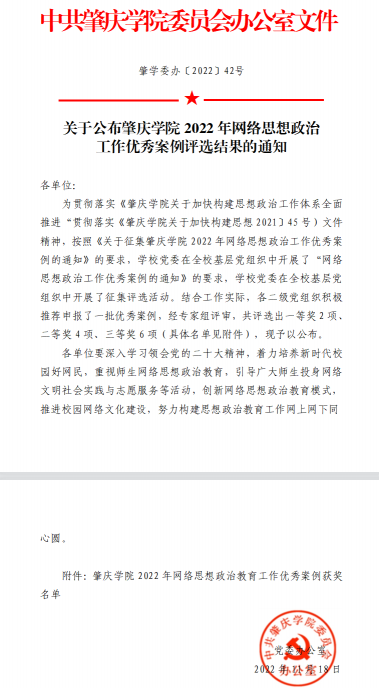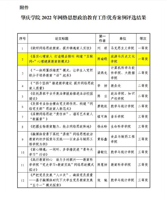 近日,肇庆学院2022年网络思想政治工作优秀案例评选活动中,我院辅导员陈瑜瑕老师撰写的网络思政工作案例《落实心理育人 打造精品期刊 构建“互联网+”心理健康教育新模式》荣获一等奖。