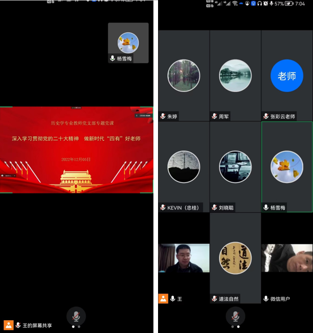 12月5日,历史学专业教师党支部围绕党的二十大精神组织开展线上专题学习,党支部书记王建博士主持,全体支部党员参加。