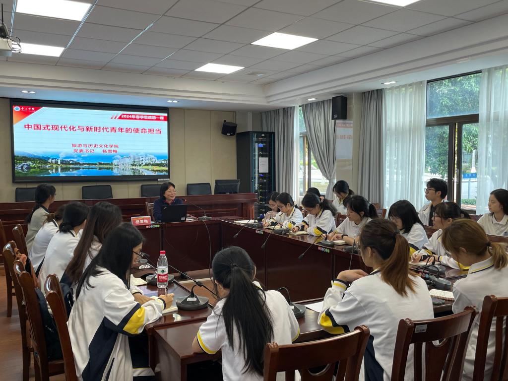 学院党委书记杨雪梅以《中国式现代化与新时代青年的使命担当》为题讲授思政第一课。她从“为什么读书?”和党的二十大报告导入,从中国式现代化的历史演进、中国式现代化的理论体系、新时代青年的使命与担当三个方面进行阐述,脉络清晰,内容丰富,深入浅出。她指出,作为新时代青年,同学们要勇担时代使命,坚定理想信念,把个人的成长发展融入国家发展大局,练就过硬本领,用实际行动践行奋斗精神,在推进中国式现代化建设中贡献青春力量,奋力书写无愧于党、无愧于人民、无愧于时代的青春篇章。