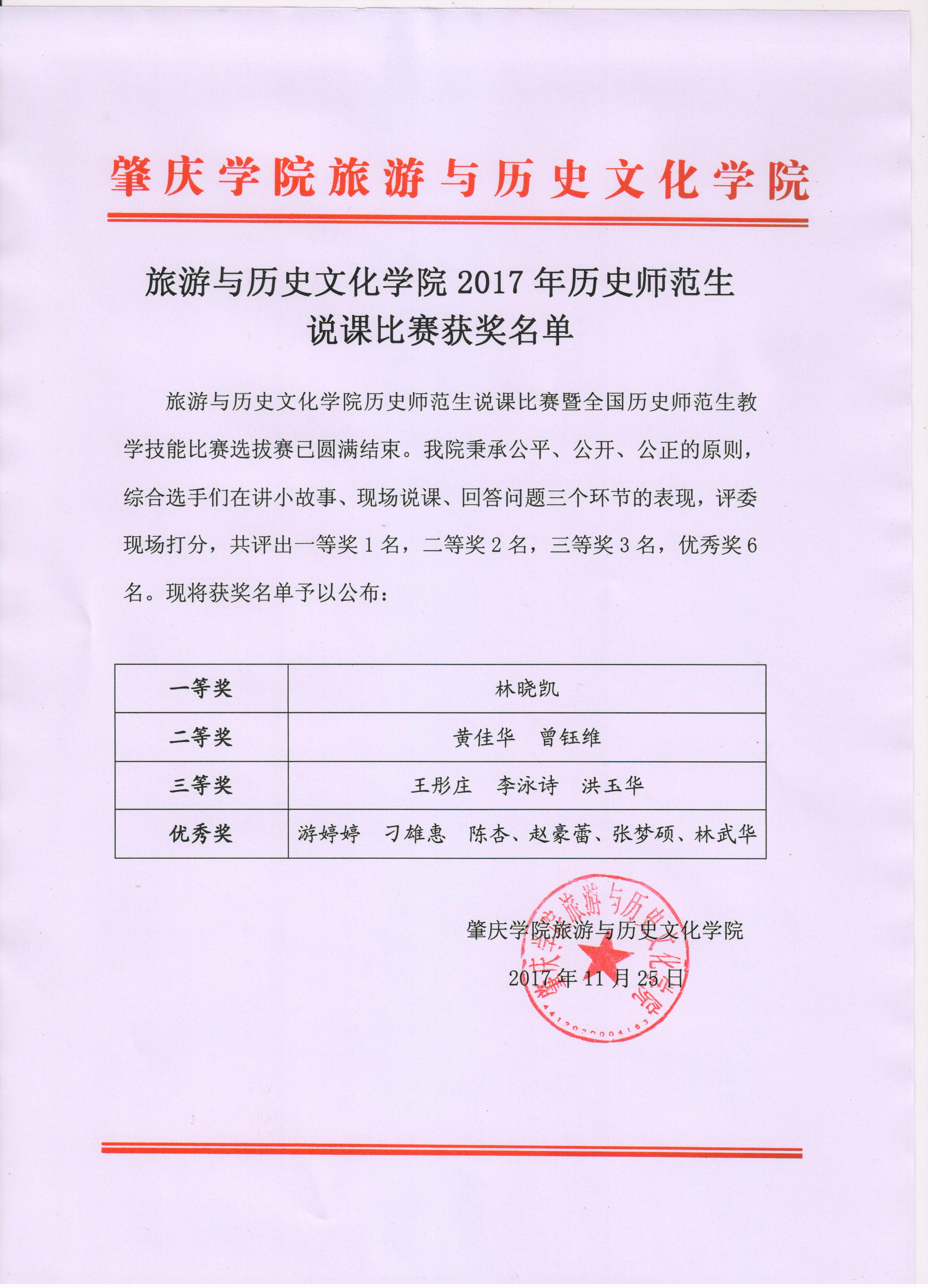 旅游与历史文化学院2017年历史师范生说课比赛获奖名单