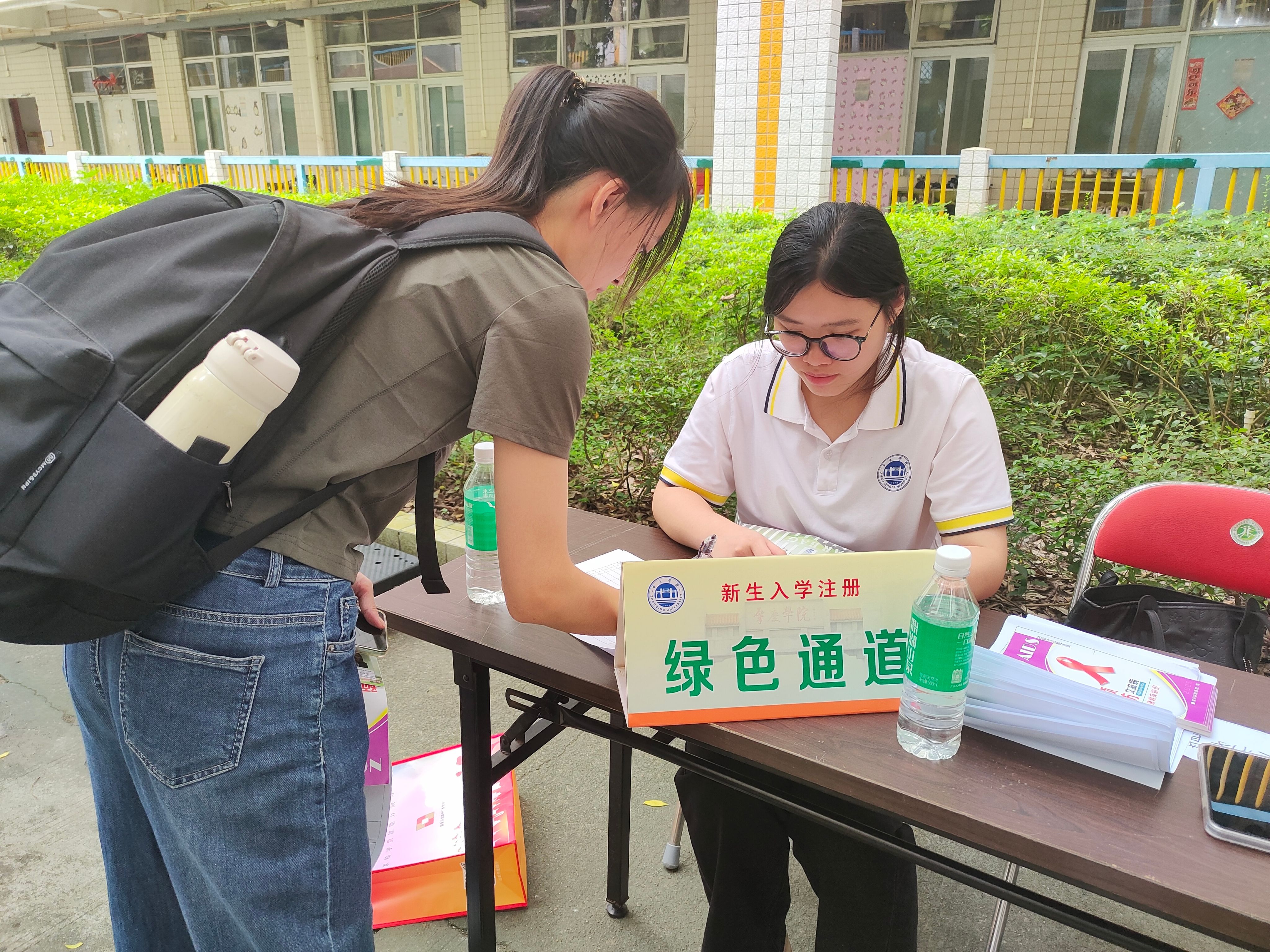 夏日高温下,迎新志愿者们始终保持热情饱满的状态,以高度负责的态度引导新生办理报到手续。在繁忙的报到现场,一块白底绿字的 “绿色通道” 标识牌格外显眼,成为现场的独特亮点。学院在此专门组建资助工作小组,不仅主动向新生普及学校奖助政策,耐心解答各类资助疑问,细致记录家庭经济困难学生的基础信息,确保资助服务全覆盖。