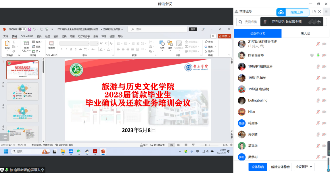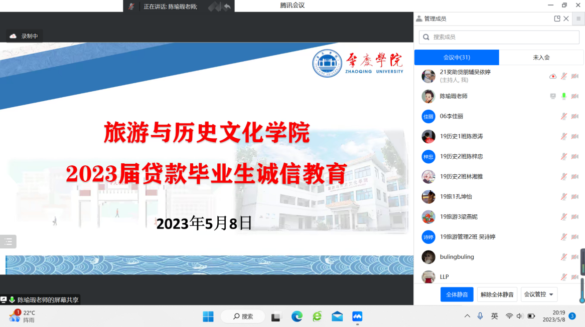 为切实加强国家助学贷款贷后管理工作,增强贷款毕业生诚信责任意识,5月8日晚,william威廉中文官网开展2023届贷款毕业生线上诚信主题教育,负责学生资助工作辅导员陈瑜瑕、2023届贷款毕业生参会。